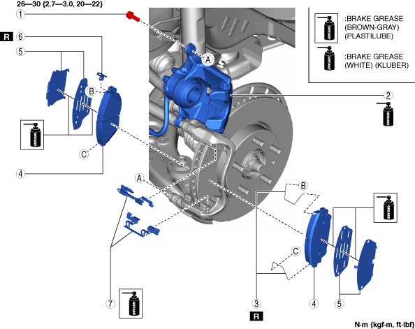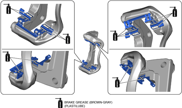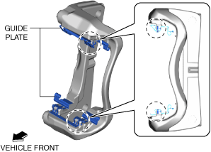 • When assembling the guide plates to the front brake mounting support, securely assemble them on the leading side and trailing side to each position shown in the figure. If the guide plates are assembled to the incorrect positions, it could become a source of noise.