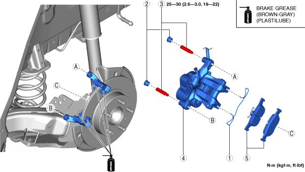 2.While holding retaining clip A so that it does not detach from the rear brake caliper, install retaining clip B to the rear brake mounting support.