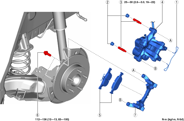 2.While holding retaining clip A so that it does not detach from the rear brake caliper, install retaining clip B to the rear brake mounting support.