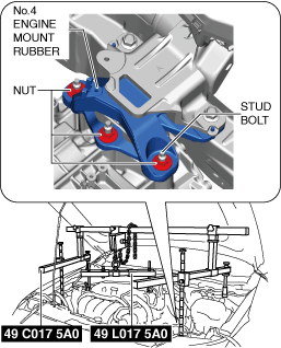 5.Lift up the transaxle using the SSTs, pass the stud bolt through the No.4 engine mount rubber, and temporarily tighten the No.4 engine mount rubber installation nuts.
