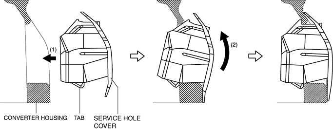 (2)Move the service hole cover in the direction of arrow (1) shown in the figure and hook the service hole cover tab onto the converter housing.