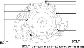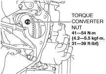 • After temporarily tightening the torque converter installation nut uniformly, tighten it to the specified torque.