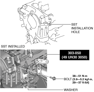 (5)Install the SST using a bolt with part number 99794 1025 or an M10—1.25, length 25 mm {0.98 in} bolt, and a washer as shown in the figure.