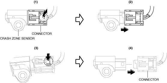 • Handling the crash zone sensor improperly can accidentally operate (deploy) the air bag module, which may seriously injure you. Read the air bag system service warnings and cautions before handling the crash zone sensor. (See AIR BAG SYSTEM SERVICE WARNINGS [TWO-STEP DEPLOYMENT CONTROL SYSTEM – US/CANADA SPEC.].) (See AIR BAG SYSTEM SERVICE CAUTIONS [TWO-STEP DEPLOYMENT CONTROL SYSTEM – US/CANADA SPEC.].)
