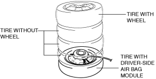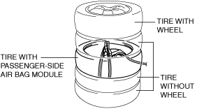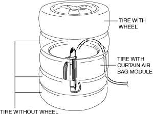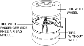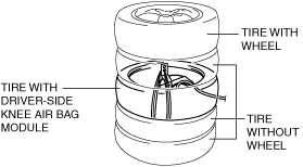 12.Stack the tire with the passenger-side knee air bag module on top of two tires without wheels. Stack a tire without a wheel on top of the tire with the passenger-side knee air bag module, and then stack another tire with a wheel on the very top.