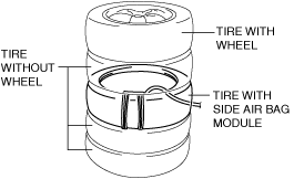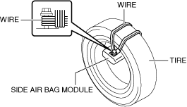 4.Put the side air bag module inside the tire and secure it to the tire by wrapping a wire (cross section of 1.25 mm2 {0.002 in2} or more) through the tire and the bolt at least 4 times.