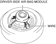5.Place the driver-side air bag module on the center of the tire wheel with the padded surface facing up. To secure the air bag module to the tire wheel, wrap a wire (cross section 1.25 mm2 {0.002 in2} or more) through the wheel and the bolt installation holes of the air bag module at least 4 times.
