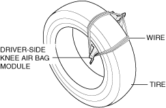 11.Place the padded surface of the driver-side knee air bag module facing the center of the tire as shown in the figure. To secure the air bag module to the tire wheel, wrap a wire (cross section 1.25 mm2 {0.002 in2} or more) through the tire and the bolt installation holes at least 4 times as shown in the figure.