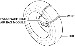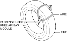 11.Place the padded surface of the passenger-side knee air bag module facing the center of the tire as shown in the figure. To secure the air bag module to the tire wheel, wrap a wire (cross section 1.25 mm2 {0.002 in2} or more) through the tire and the bolt installation holes at least 4 times as shown in the figure.