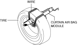 5.Secure the curtain air bag module to the tire, by wrapping a wire (cross section 1.25 mm2 {0.002 in2} or more) through the tire and the bolt installation holes at least 4 times as shown in the figure.