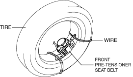 4.Put the front pre-tensioner seat belt inside the tire and secure it to the tire by wrapping a wire (cross section of 1.25 mm2 {0.002 in2} or more) through the tire and the bolt installation holes at least 4 times.