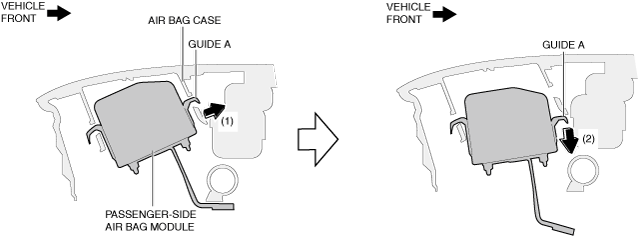9.Move the passenger-side air bag module in the direction of arrow (2) shown in the figure and detach guides A from the air bag case while spreading the air bag case in the direction of arrow (1).