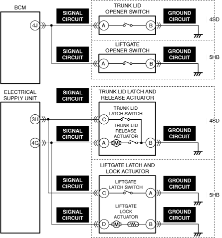 • Short to ground or open circuit in trunk lid latch and release actuator signal circuit (4SD)/liftgate latch and lock actuator signal circuit (5HB)