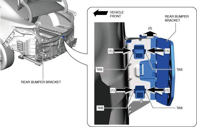 3.While pressing the rear bumper bracket tabs in the direction of arrows (1) shown in the figure, move the rear bumper bracket in the direction of arrow (2) and detach the rear bumper bracket from the body.