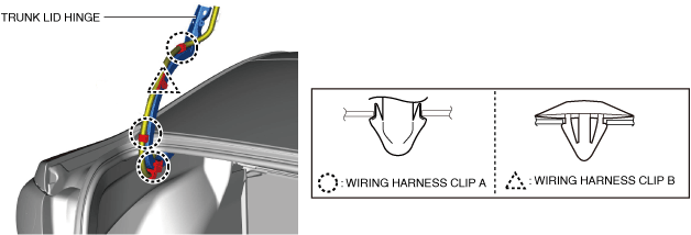 2. Remove wiring harness clips A and B securing the trunk lid hinge.
