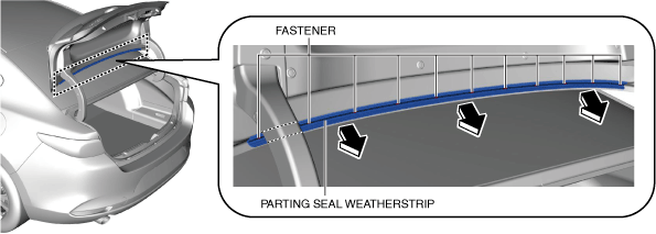 1.Remove the parting seal weatherstrip in the direction of the arrows shown in the figure while detaching the fasteners.