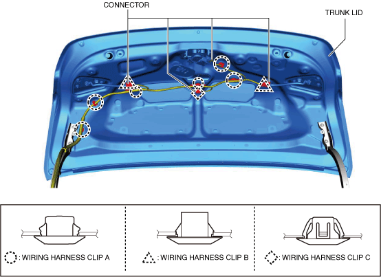 6.Disconnect the connectors and remove wiring harness clips A, B and C securing the trunk lid.