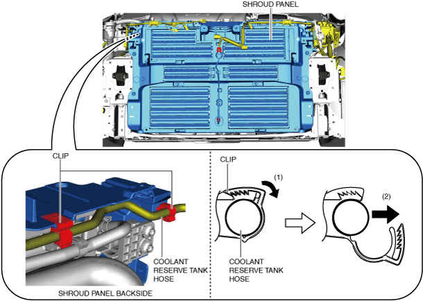 7.Open the clips in the direction of arrow (1) shown in the figure and remove the coolant reserve tank hose in the direction of arrow (2).