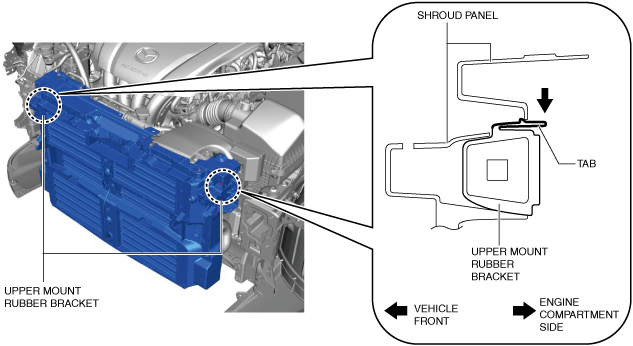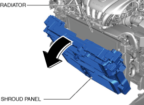 11.Hold the upper part of the radiator by hand and tilt the shroud panel toward the vehicle front.