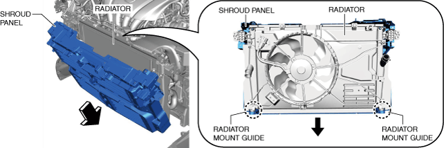 12.Move the shroud panel to the lower side with the radiator held by hand, detach it from the radiator mount guide, and remove the shroud panel toward the vehicle front.