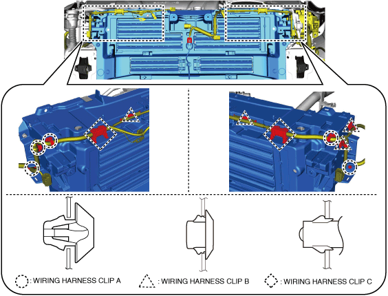 6.Remove wiring harness clips A, B and C secured to the shroud panel.