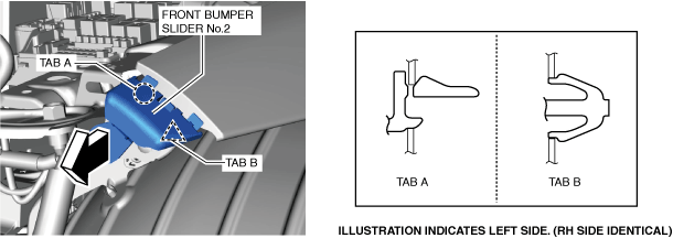 4.Move front bumper slider No.2 in the direction of the arrow shown in the figure and remove it while detaching tabs A and B.