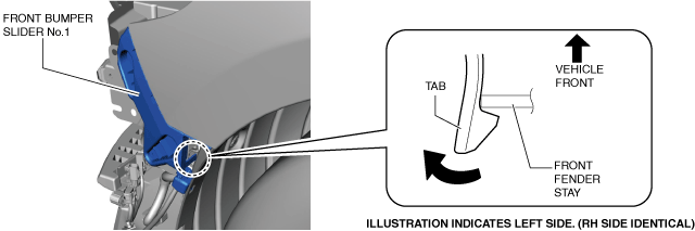 4.Move the front bumper slider No.1 tab in the direction of the arrow shown in the figure and detach it from the front fender stay.