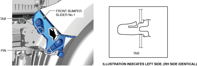 5.Pull front bumper slider No.1 in the direction of the arrow shown in the figure while detaching the tab and pin.