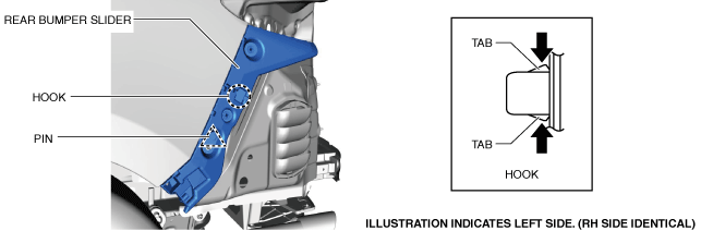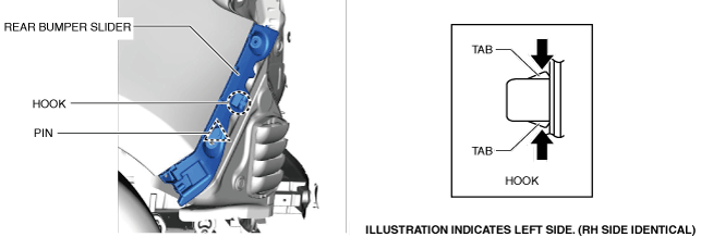 4.Press the hook tabs shown in the figure and remove the rear bumper slider from the rear fender panel.