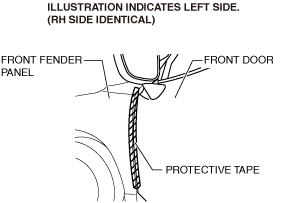 • When the front door checker securing bolt is removed, the front door may open until it contacts the front fender panel causing the front door and the front fender panel to be damaged. Before removing the front door, overlap and adhere the protective tape to the position shown in the figure and be careful not to damage the front door and the front fender panel.