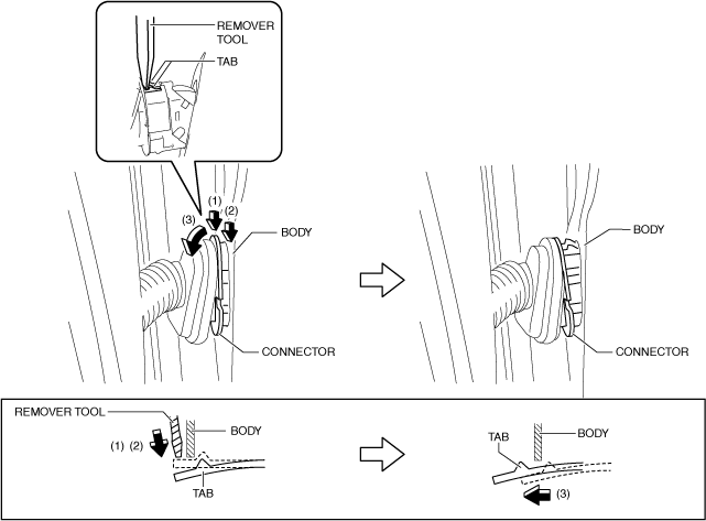 2.Using a remover tool, press the tabs in the direction of arrows (1) and (2) shown in the figure and remove the connector from the body in the direction of arrow (3).