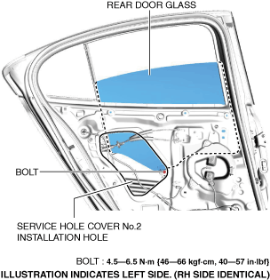 • If the bolt is removed without supporting the rear door glass, the rear door glass may fall off and be damaged. Remove the bolt while inserting your hand into the service hole cover No.2 installation hole to support the rear door glass.