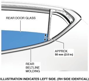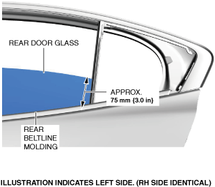 • Before removing the rear door glass, the removal procedure for the rear door glass installation bolt can be facilitated by adjusting the top of the rear door glass to the position approx. 75 mm {3.0 in} (4SD) or approx. 50 mm {2.0 in} (5HB) away from the upper part of the rear beltline molding.