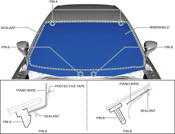 • Before removing pin B from the windshield glass, place an alignment mark on the windshield.
