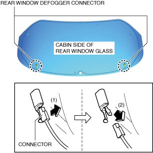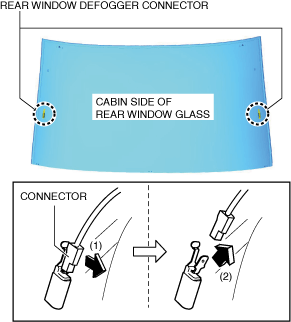 3.Disconnect the rear window defogger connectors in the direction of the arrows in the order of (1), (2) shown in the figure.