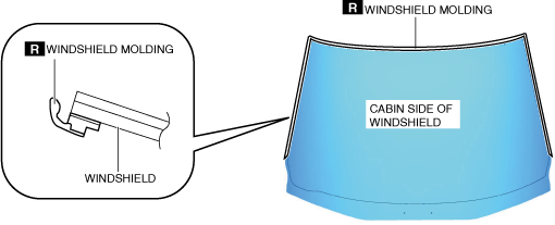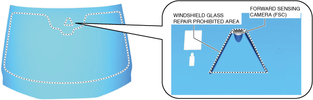 • If a door is opened or closed when all the window glass is closed, the resulting change in air pressure could cause the sealant to crack preventing the proper installation of the windshield. Keep the door glass opened until the windshield installation is completed.• If there is damage or cracking in the windshield glass repair prohibited area, replace the windshield. If the damage or cracking in the windshield glass repair prohibited area is repaired, it could affect the recognition of the Forward Sensing Camera (FSC) and the system may not operate normally.