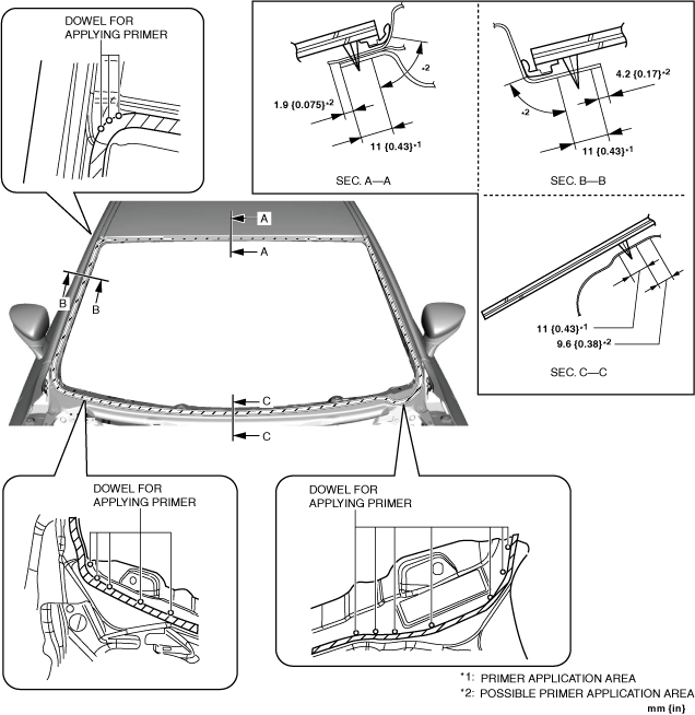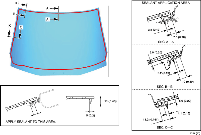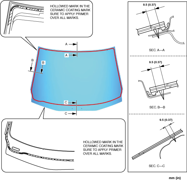 1.Clean and degrease an approx. 50 mm {2.0 in} wide strip along the perimeter of the windshield.