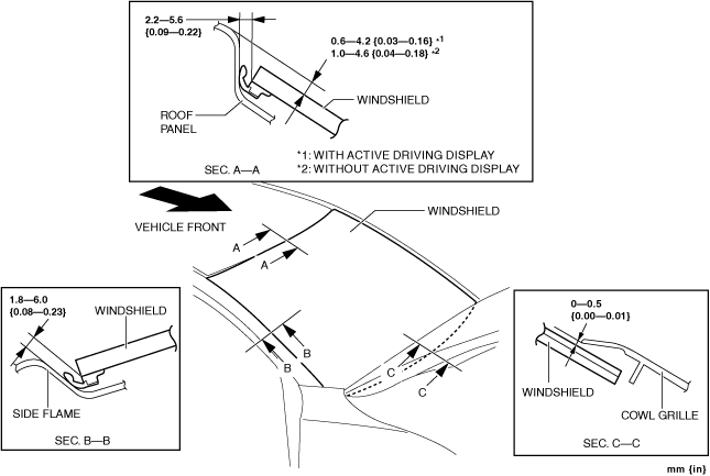 15.Verify that the gaps and heights between the side frame and windshield, between the roof panel and windshield, and between the cowl grille and windshield are within the ranges shown in the figure, and completely press along the perimeter of the glass.