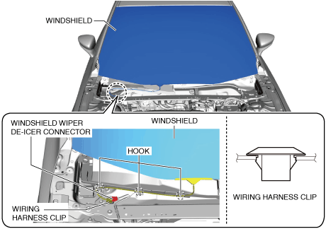13.Install the windshield wiper de-icer wiring harness to the hooks. (with windshield wiper de-icer)