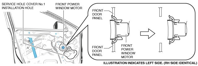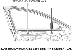 • When removing the front power window regulator, the front power window regulator may contact the service hole cover No.2 installation hole, and the coating film of the front door inner panel and the front power window regulator could be damaged. Remove the front power window regulator while verifying that the front power window regulator and the service hole cover No.2 installation hole do not contact each other.