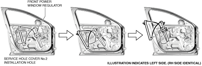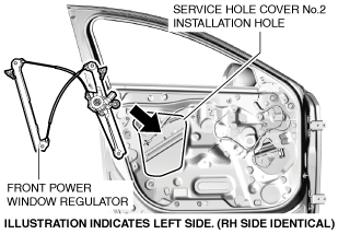 - (2)Insert the front power window regulator from the service hole cover No.2 installation hole.