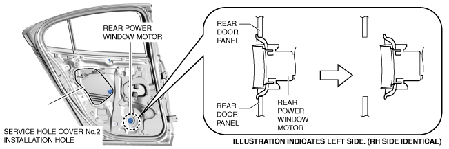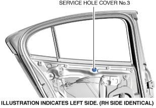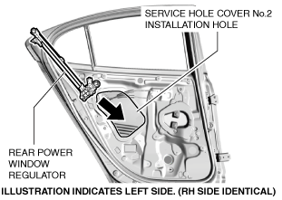 • When removing the rear power window regulator, the rear power window regulator may contact the service hole cover No.2 installation hole, and the coating film of the rear door inner panel and the rear power window regulator could be damaged. Remove the rear power window regulator while verifying that the rear power window regulator and the service hole cover No.2 installation hole do not contact each other.