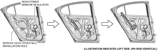 - (2)Insert the rear power window regulator from the service hole cover No.2 installation hole.