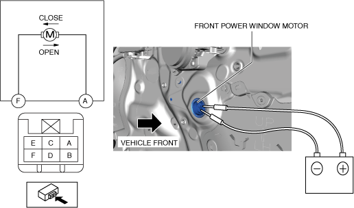 3.Apply battery positive voltage and connect the ground to power window motor terminals A and F, and then inspect the power window motor operation.