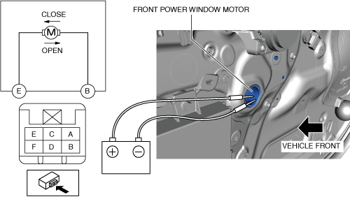 3.Apply battery positive voltage and connect the ground to power window motor terminals B and E, and then inspect the power window motor operation.