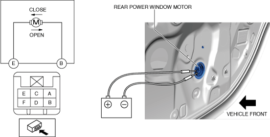 3.Apply battery positive voltage and connect the ground to power window motor terminals B and E, and then inspect the power window motor operation.