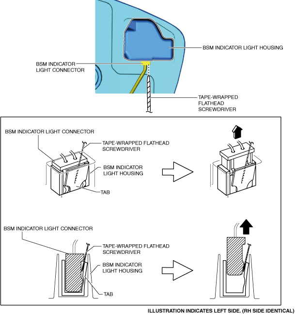 • Remove the BSM indicator light connector being careful not to pry the BSM indicator light housing after inserting a tape-wrapped flathead screwdriver. If the BSM indicator light connector and the housing are damaged or deformed, poor contact of the connector may occur, causing the indicator light not to turn on.