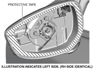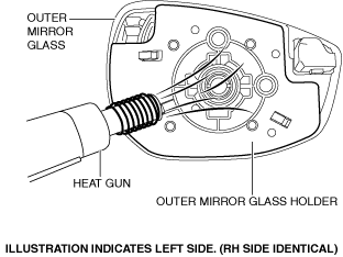 • Installation of the outer mirror glass can be facilitated by heating the outer mirror glass holder to approx. 50 °C {90 °F} to 60 °C {108 °F} using a heat gun.