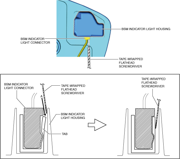 • Lightly pull the BSM indicator light connector and verify that the BSM indicator light housing cannot be pulled off. If the connection is poor, insert a tape-wrapped flathead screwdriver into position A shown in the figure and engage the connector.