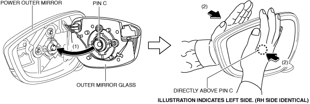 6.Align the outer mirror glass with the outer mirror in the direction of arrow (1) shown in the figure and install pin C while pressing in the directions of arrows (2).